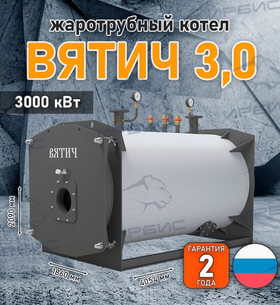 «Вятич 3,0» — водогрейный жаротрубно-дымогарный котел мощностью 3 МВт с реверсивной топкой. Котел «Вятич», в зависимости от типа горелочного устройства, может работать на природном газе или жидком топливе и выполнен в газоплотном исполнении с работой под наддувом.